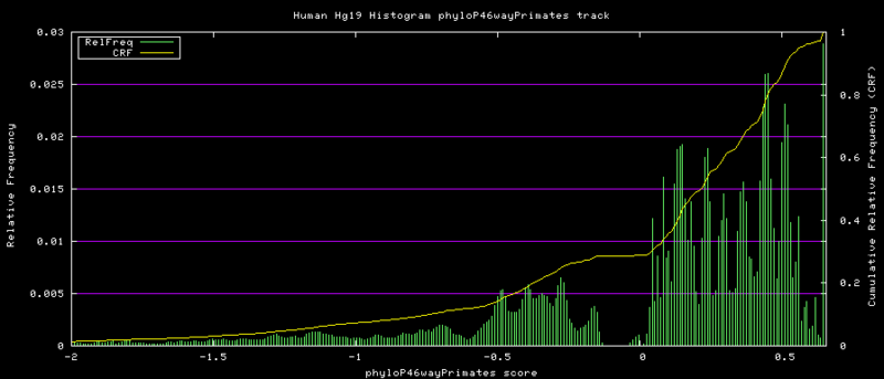46-way conservation track on human genome browser hg19. phyloP histogram data for all primates subset